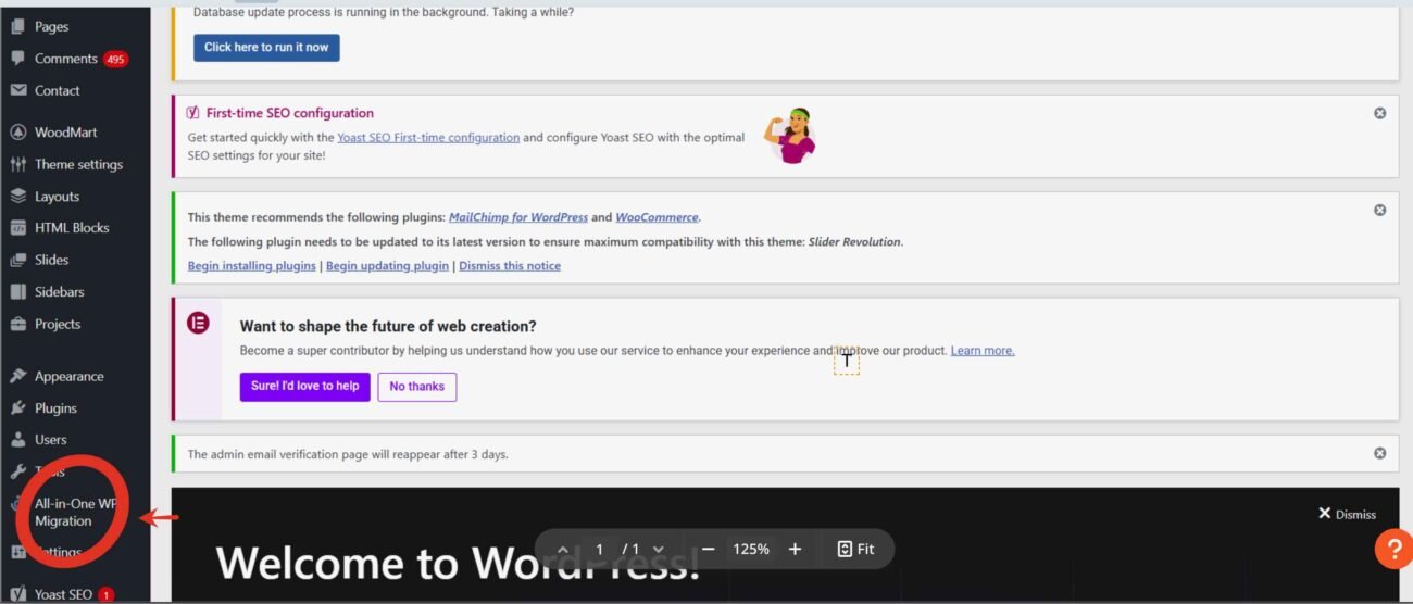 - Verify the “plugin” appears under All-in-One WP Migration in the dashboard area.