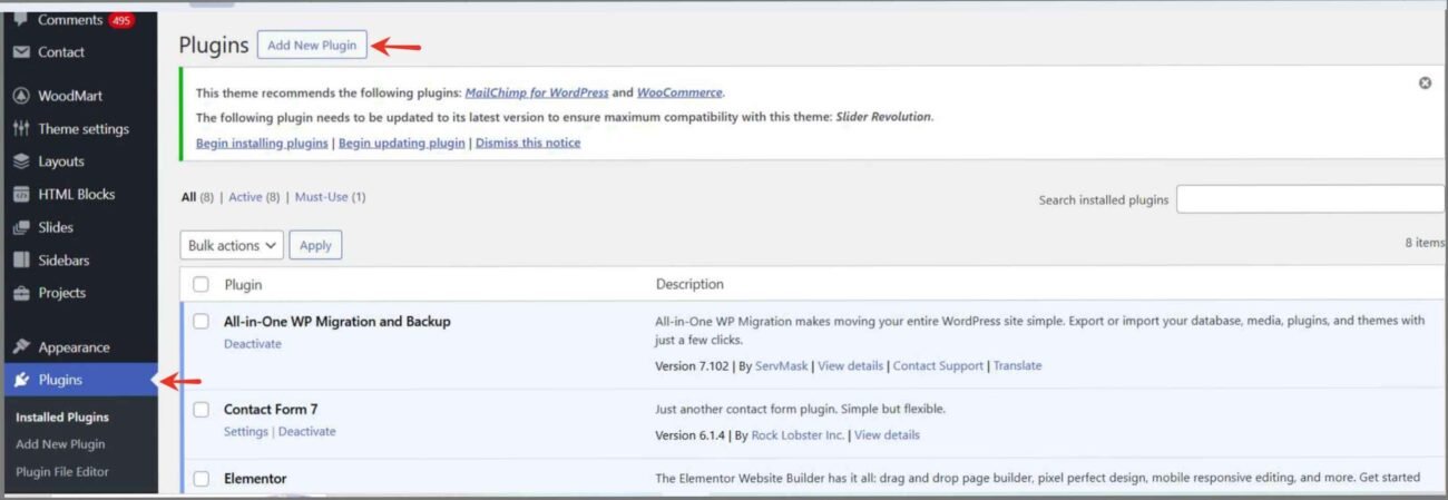 - Go to the “Plugins” area on the left side of your wordpress dashboard > click on “Add New”.